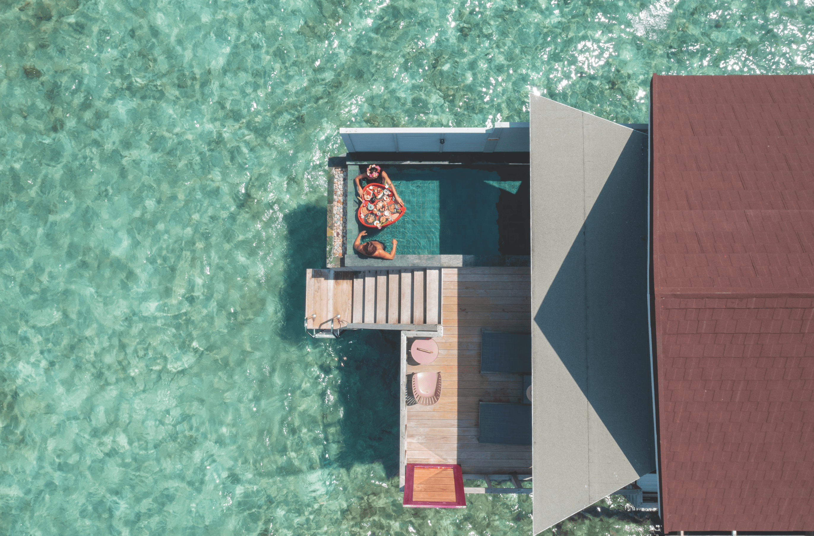 "The Retreat" is an adult-only enclave set over water in the lagoon, featuring a lounge, and pool area, with lunch, afternoon tea, and aperitif hour and drink offered daily.